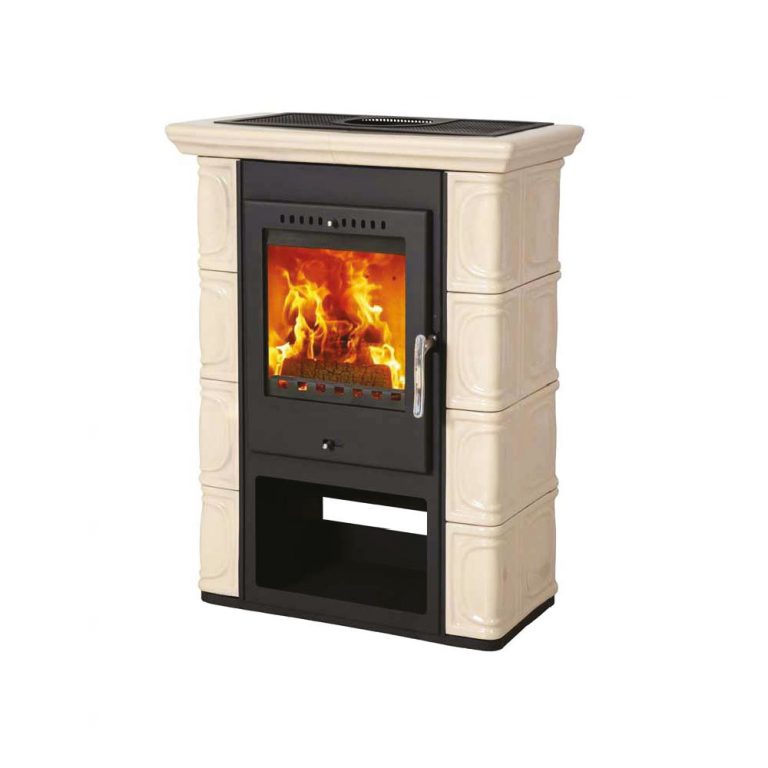 Wnętrze wyłożone szamotem dla zapewnienia skutecznego i czystego spalania drewna. Wykonany z blachy pomalowanej proszkowo na czarno i ozdobiony klasycznymi ceramicznymi kaflami w kolorze kremowym. W górnej części stalowa krata zwiększający przepływ gorącego powietrza. Idealnie odnajdzie się w stylowych pomieszczeń urządzonych w klimacie retro.