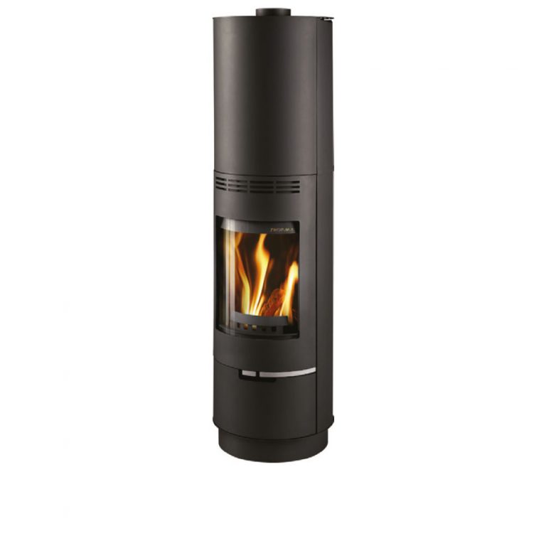 Wnętrze wyłożone wermikulitem dla zapewnienia skutecznego i czystego spalania drewna. Wykonany z blachy pomalowanej proszkowo na kolor czarny. Idealnie wpasowuje się w nowoczesne i minimalistyczne wnętrza. Zintegrowany panel konwekcyjny umożliwia umiejscowienie pieca w bliskiej odległości od ściany.