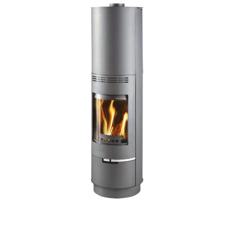 Wnętrze wyłożone wermikulitem dla zapewnienia skutecznego i czystego spalania drewna. Wykonany z blachy pomalowanej proszkowo na kolor szary. Idealnie wpasowuje się w nowoczesne i minimalistyczne wnętrza. Zintegrowany panel konwekcyjny umożliwia umiejscowienie pieca w bliskiej odległości od ściany.