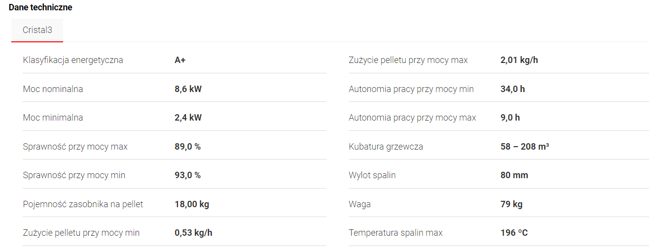 Model Cristal3 o mocy 9 kW stworzony został do ogrzewania większych pomieszczeń. Wyposażony jest w tygodniowy programator. Jego niewielkie rozmiary i prosta konstrukcja, w połączeniu z najwyższą wydajnością czynią go bardzo praktycznym. Umiarkowane zużycie pelletu zapewnia ciągłą pracę urządzenia od 9 do 34 godzin. Oznacza to, że zawsze będzie w stanie dostarczyć odpowiednią temperaturę w pomieszczeniach, przez długi czas. Jest niezwykle łatwy w użyciu, wystarczy kilka intuicyjnych czynności, aby go włączyć i ustawić.