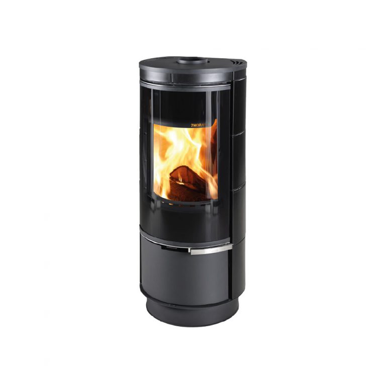 Wnętrze wyłożone wermikulitem dla zapewnienia skutecznego i czystego spalania drewna. Wykonany z blachy pomalowanej proszkowo na kolor czarny oraz pięknych czarnych kafli. Idealnie wpasowuje się w nowoczesne i minimalistyczne wnętrza. Zintegrowany panel konwekcyjny umożliwia umiejscowienie pieca w bliskiej odległości od ściany.