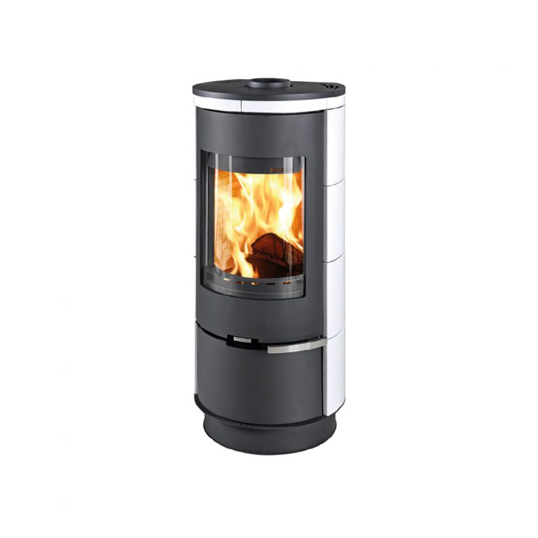 Wnętrze wyłożone wermikulitem dla zapewnienia skutecznego i czystego spalania drewna. Wykonany z blachy pomalowanej proszkowo na kolor czarny oraz pięknych białych kafli. Idealnie wpasowuje się w nowoczesne i minimalistyczne wnętrza. Zintegrowany panel konwekcyjny umożliwia umiejscowienie pieca w bliskiej odległości od ściany.
