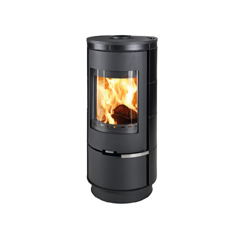 Wnętrze wyłożone wermikulitem dla zapewnienia skutecznego i czystego spalania drewna. Wykonany z blachy pomalowanej proszkowo na kolor czarny oraz pięknych czarnych kafli. Idealnie wpasowuje się w nowoczesne i minimalistyczne wnętrza. Zintegrowany panel konwekcyjny umożliwia umiejscowienie pieca w bliskiej odległości od ściany.