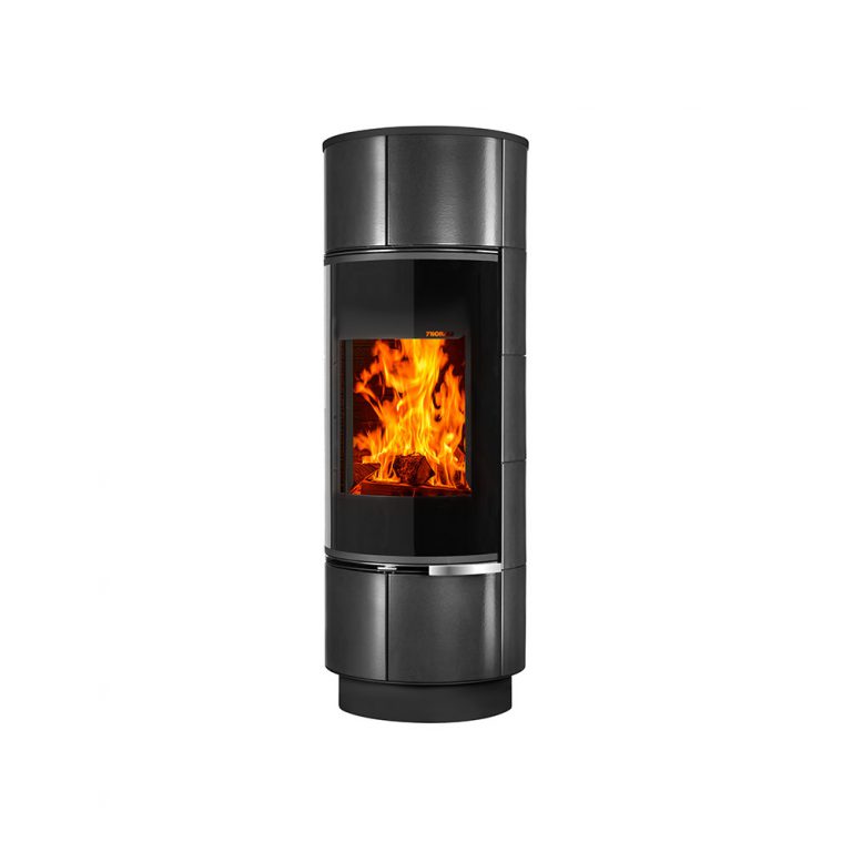 Wnętrze wyłożone wermikulitem dla zapewnienia skutecznego i czystego spalania drewna. Wykonany z blachy pomalowanej proszkowo na kolor czarny oraz pięknych grafitowych kafli. Idealnie wpasowuje się w nowoczesne i minimalistyczne wnętrza. Zintegrowany panel konwekcyjny umożliwia umiejscowienie pieca w bliskiej odległości od ściany.