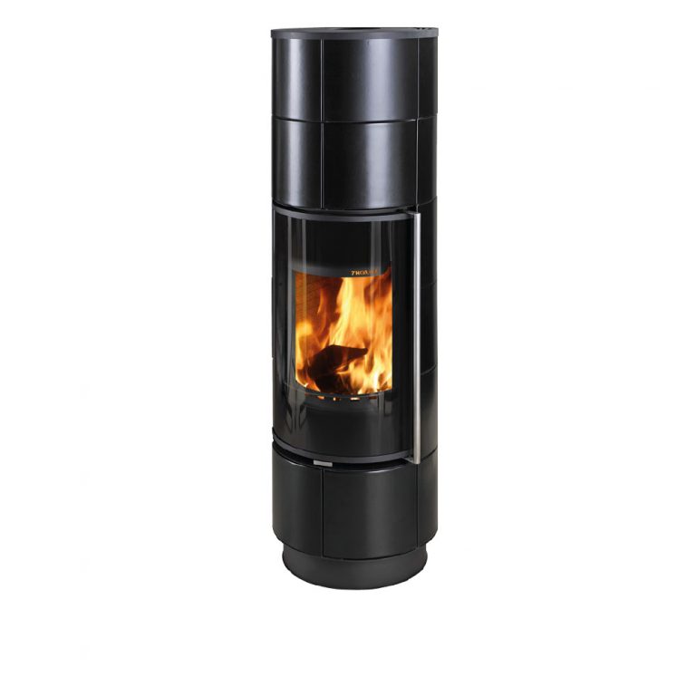 Wnętrze wyłożone wermikulitem dla zapewnienia skutecznego i czystego spalania drewna. Wykonany z blachy pomalowanej proszkowo na kolor czarny oraz pięknych czarnych kafli. Idealnie wpasowuje się w nowoczesne i minimalistyczne wnętrza. Zintegrowany panel konwekcyjny umożliwia umiejscowienie pieca w bliskiej odległości od ściany.