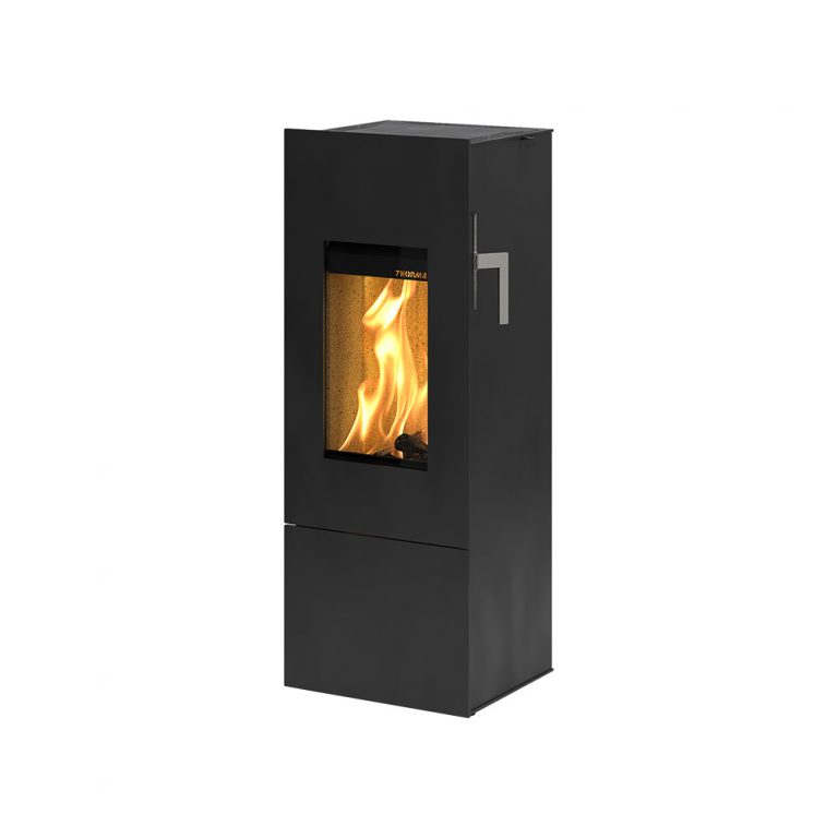 Wnętrze wyłożone wermikulitem dla zapewnienia skutecznego i czystego spalania drewna. Wykonany z blachy pomalowanej proszkowo na kolor czarny. Idealnie wpasowuje się w nowoczesne i minimalistyczne wnętrza. Zintegrowany panel konwekcyjny umożliwia umiejscowienie pieca w bliskiej odległości od ściany.